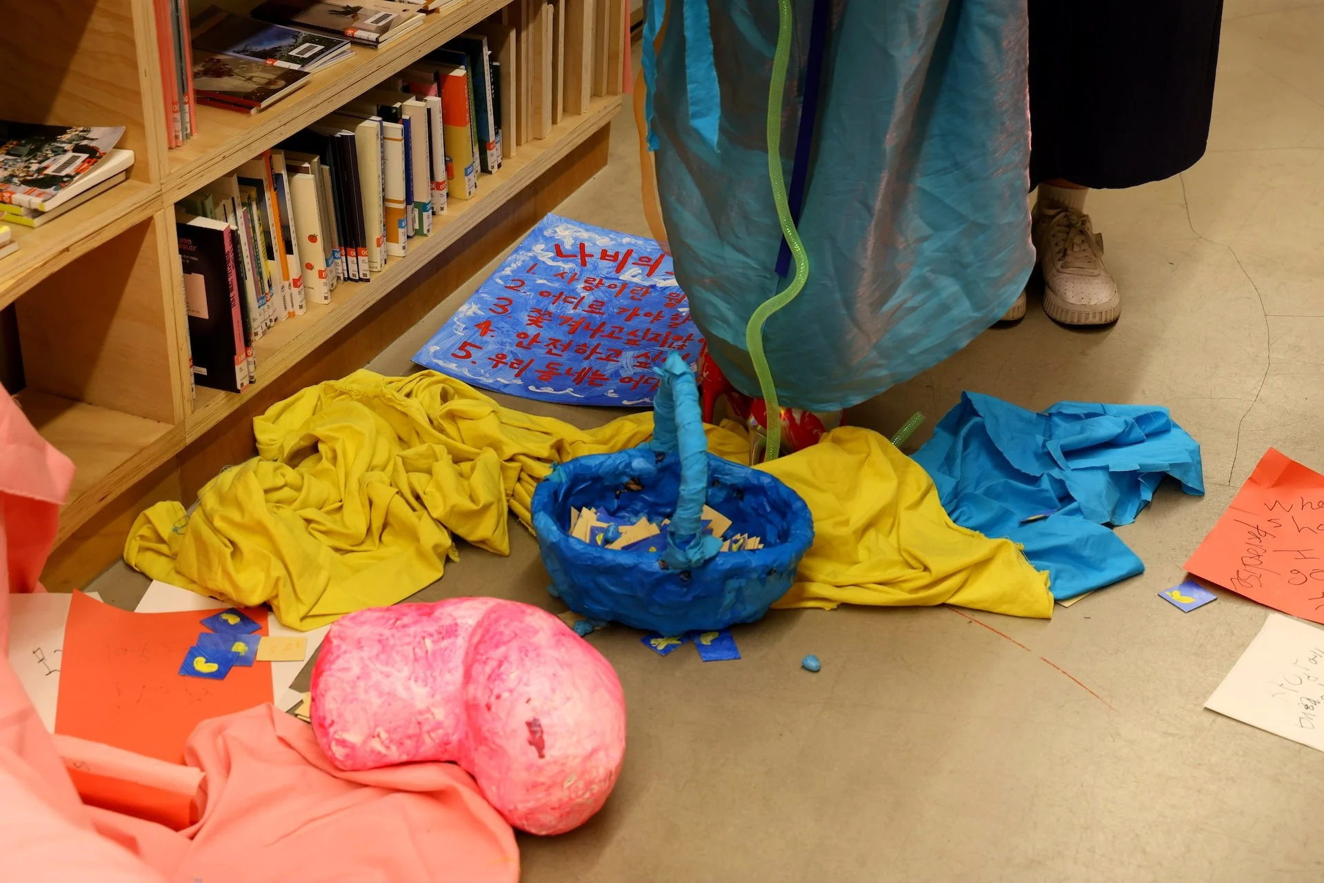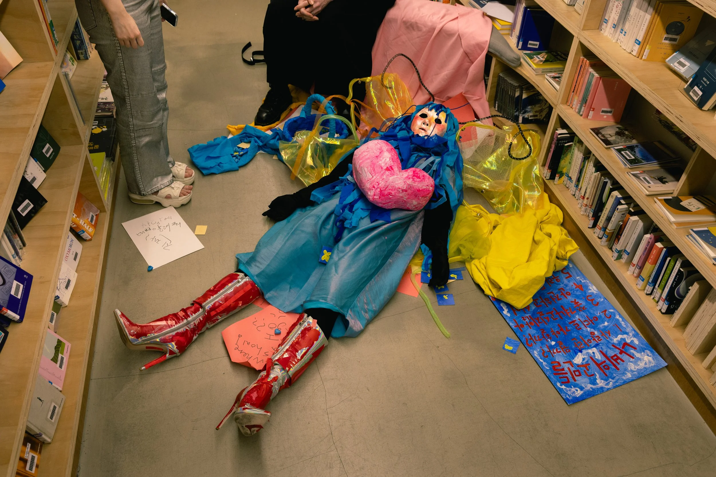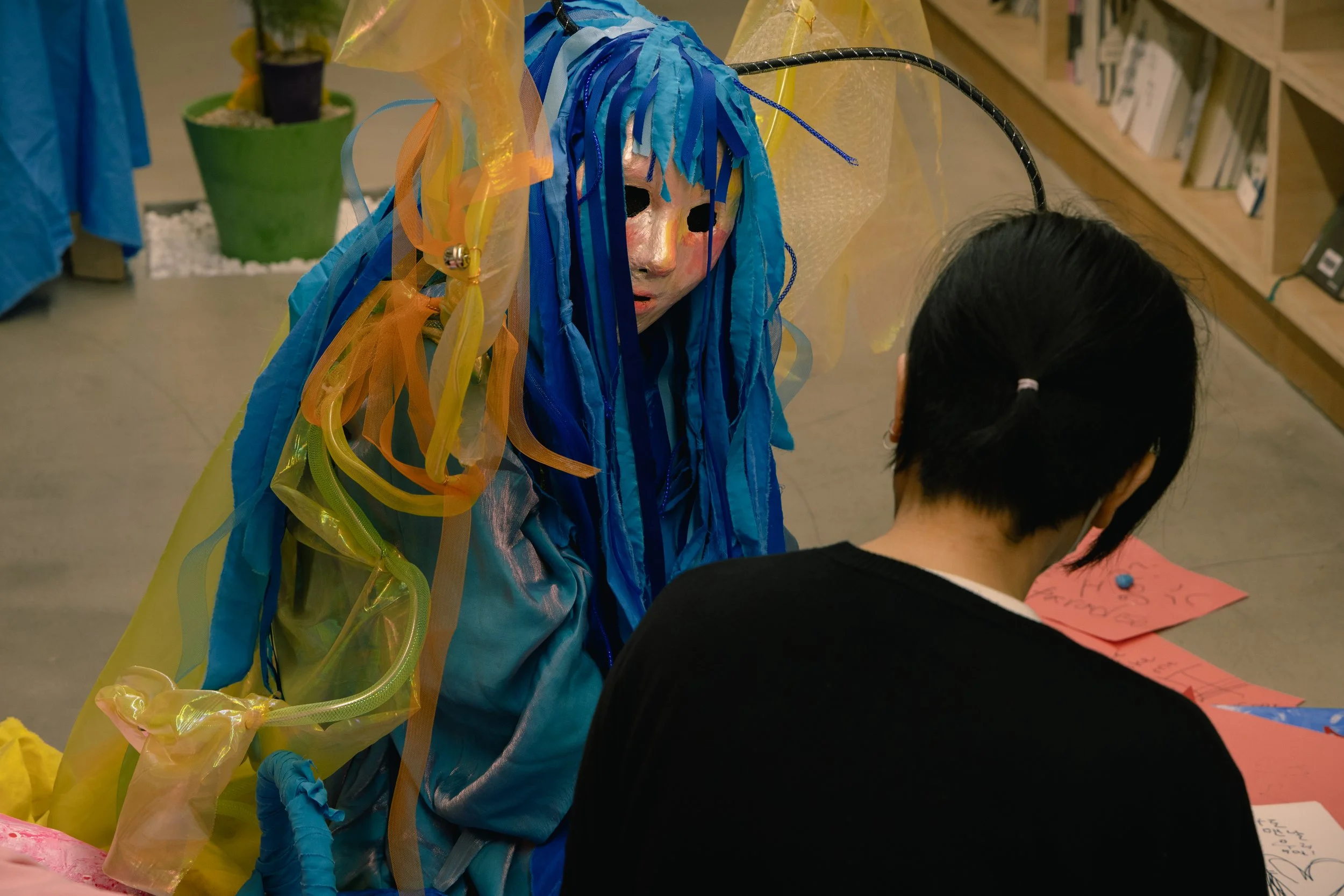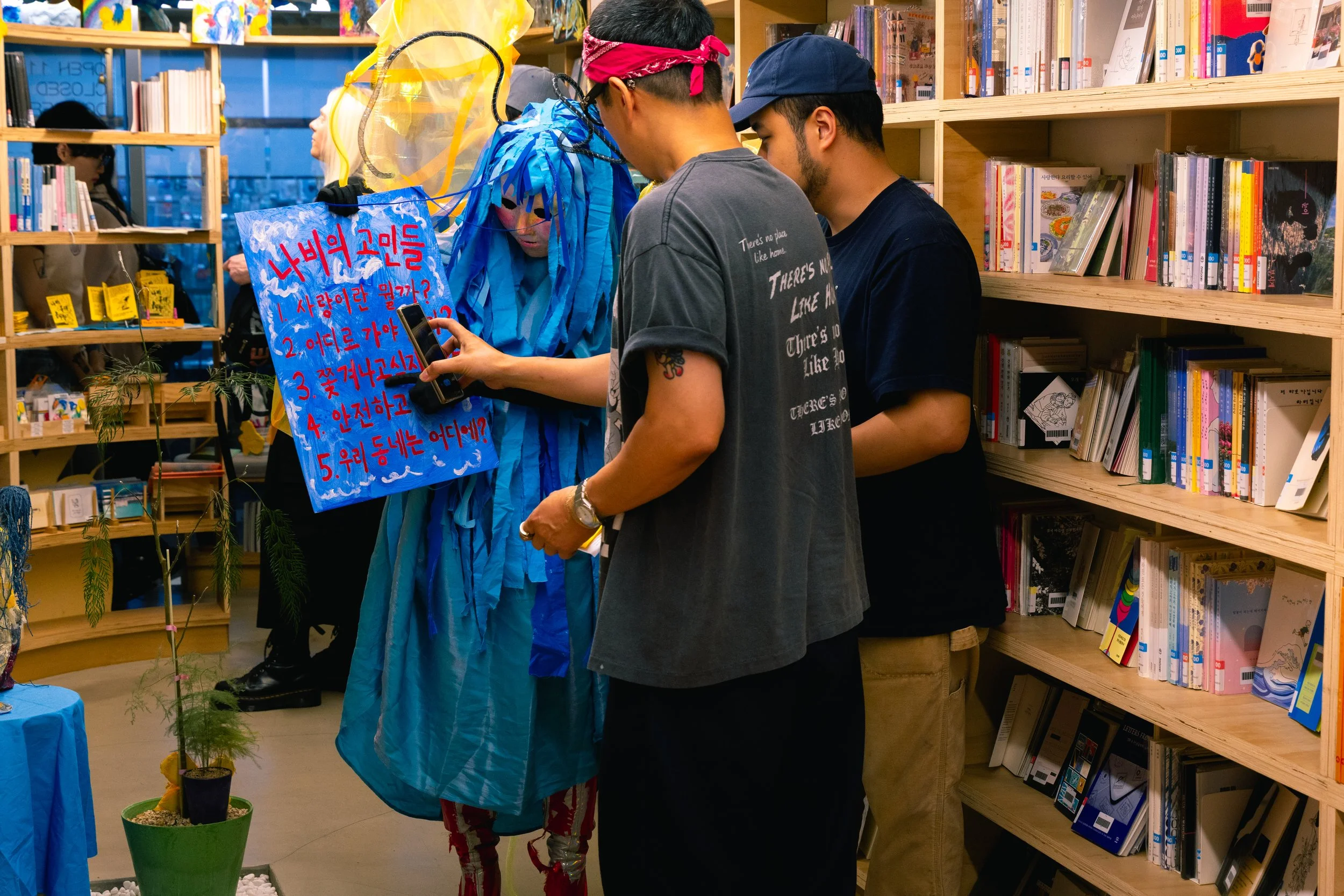 𝘕𝘢-𝘣𝘪 𝘸𝘢𝘯𝘵𝘴 𝘭𝘰𝘷𝘦! (+𝘰𝘵𝘩𝘦𝘳 𝘵𝘩𝘪𝘯𝘨𝘴) is a participatory performance that took place on June 28th, 2025, for approximately 2 hours and 20 minutes, from 8:00pm to 10:20pm. During this time, “Na-bi”, a character in Azin Lim’s art, came to life and briefly stayed in Dokseogwan to meet and talk to the audience in person. Na-bi had crash-landed in Hongdae after getting kicked out of paradise for violating societal norms, and is wandering aimlessly in search of a place where it can love and live safely. Wanting to hear people’s thoughts and advices, Na-bi presented the participants the following five concerns and asked for help: