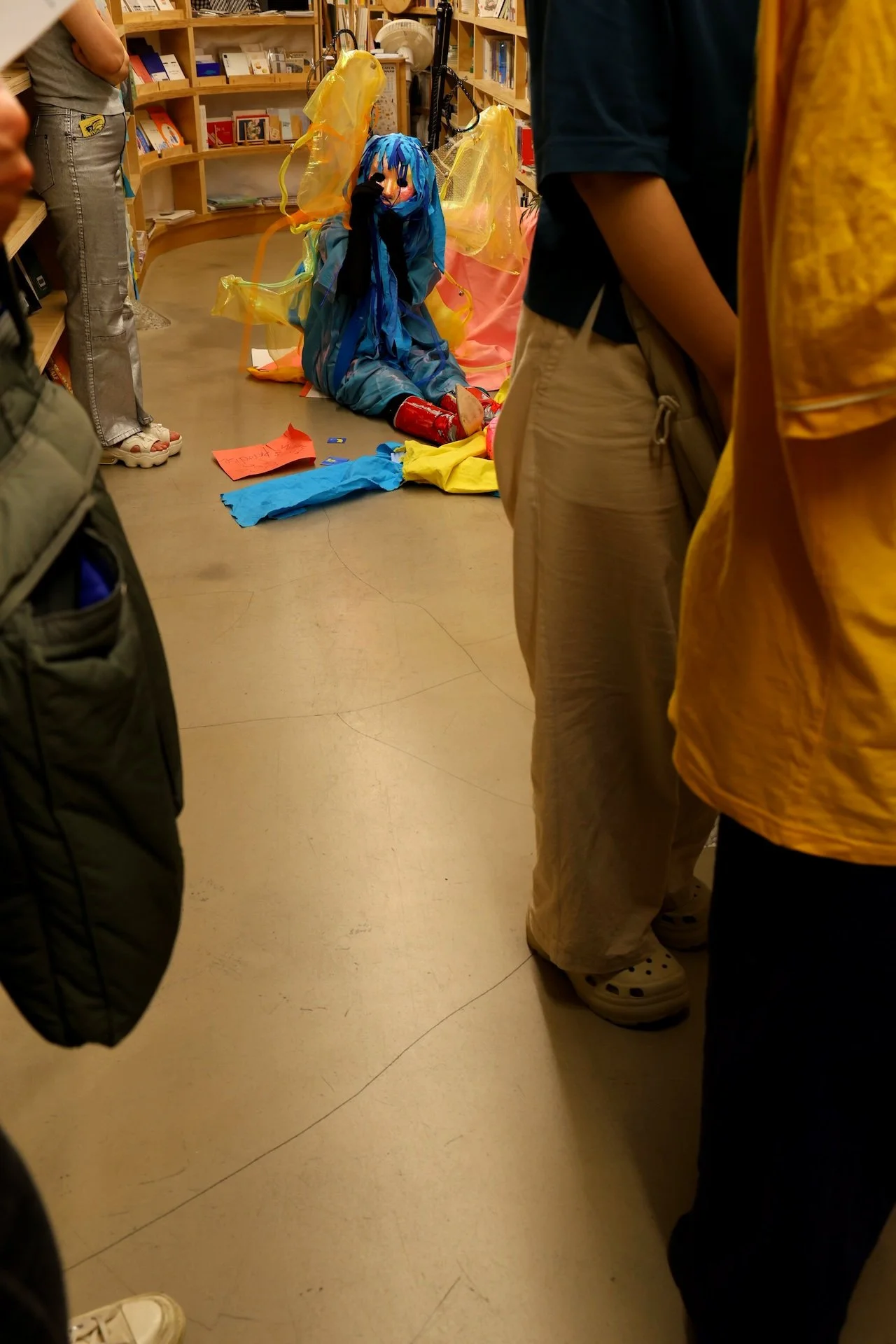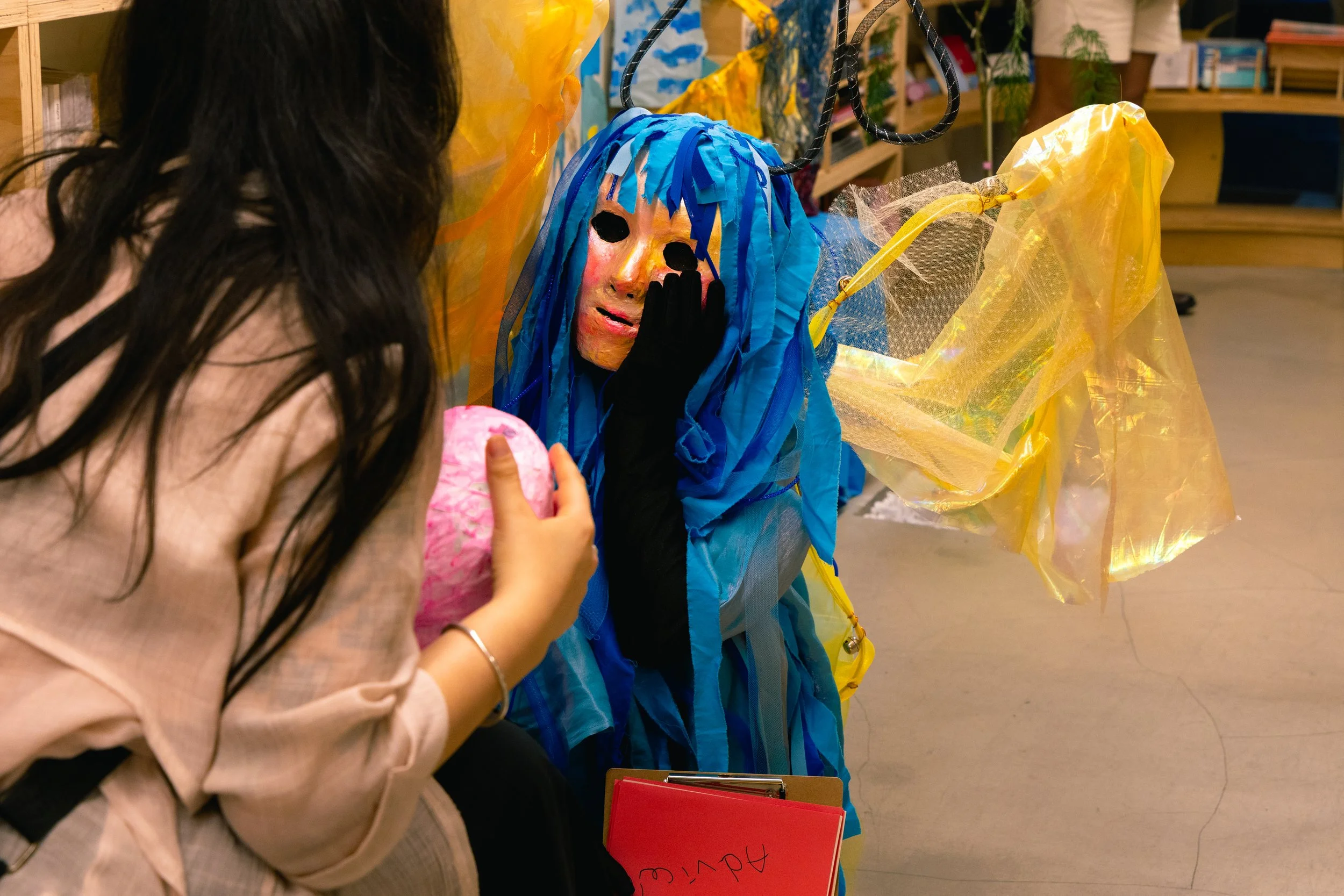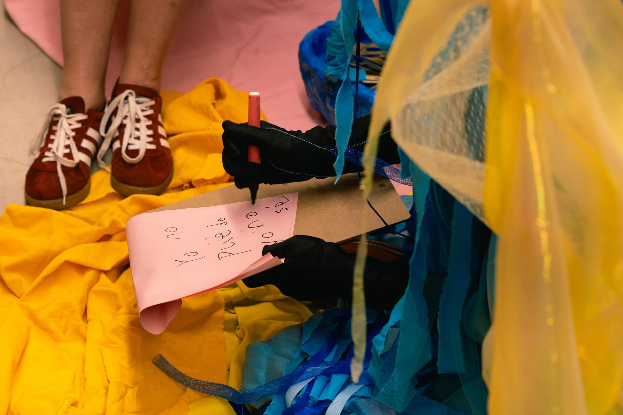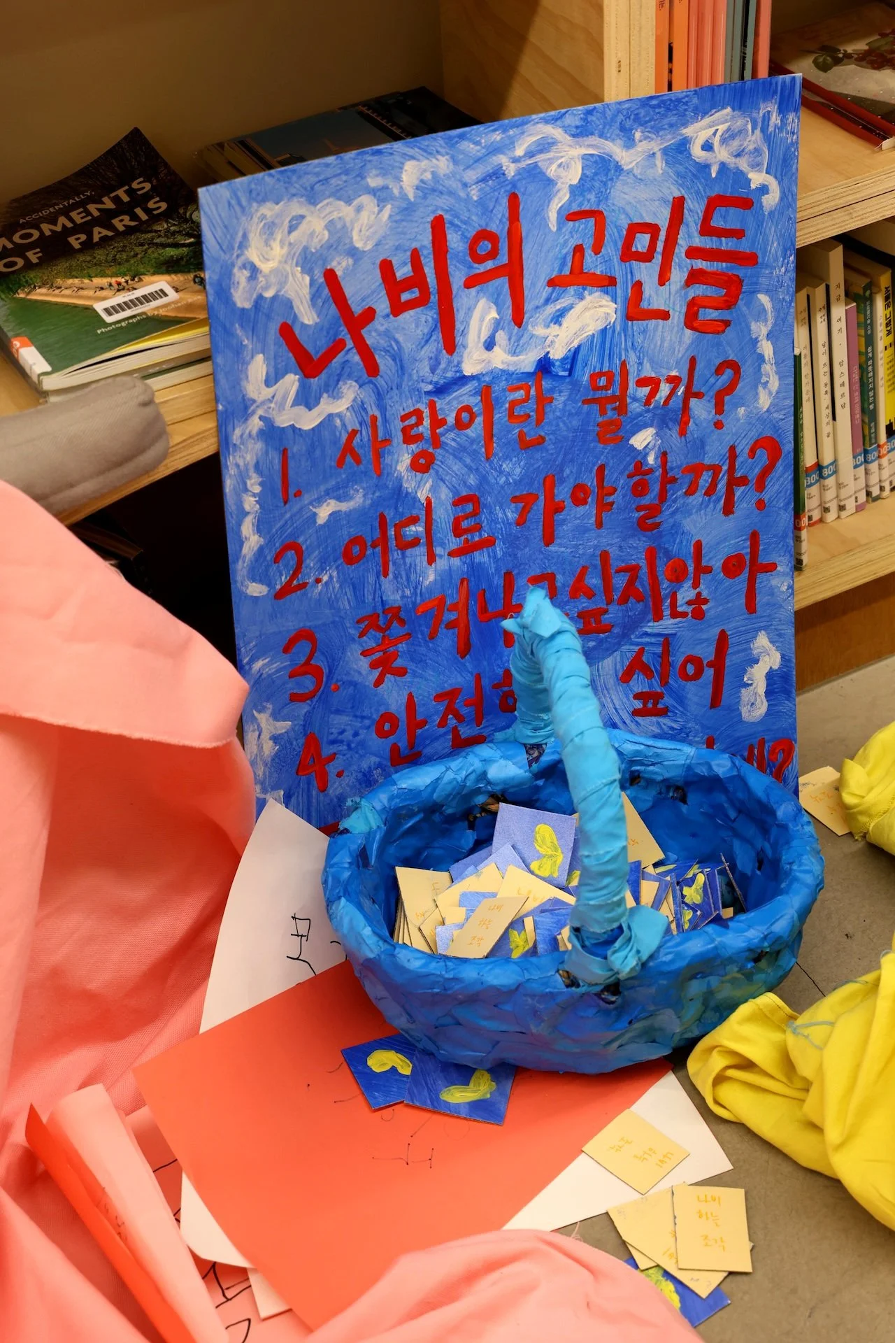 𝘕𝘢-𝘣𝘪 𝘸𝘢𝘯𝘵𝘴 𝘭𝘰𝘷𝘦! (+𝘰𝘵𝘩𝘦𝘳 𝘵𝘩𝘪𝘯𝘨𝘴) is a participatory performance that took place on June 28th, 2025, for approximately 2 hours and 20 minutes, from 8:00pm to 10:20pm. During this time, “Na-bi”, a character in Azin Lim’s art, came to life and briefly stayed in Dokseogwan to meet and talk to the audience in person. Na-bi had crash-landed in Hongdae after getting kicked out of paradise for violating societal norms, and is wandering aimlessly in search of a place where it can love and live safely. Wanting to hear people’s thoughts and advices, Na-bi presented the participants the following five concerns and asked for help: